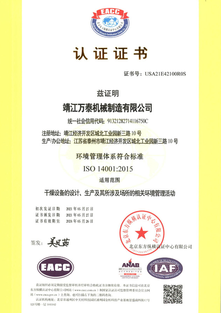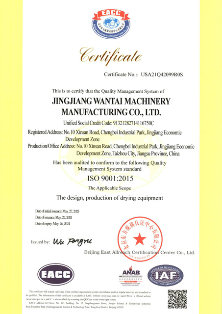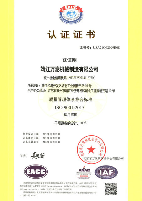 多年来,万泰人用自己的智慧在自己的领域中悄然建立新的高度,深化科学研究,在扬州大学分别合作建立了“机械工程实习基地”、“扬州大学企业研究生工作站”。先后获得了高速干燥机、膏糊状物料干燥机、多层套筒式烘干机、生物质发电机等相关专利技术。不断开拓全新的绿色烘干生产模式。